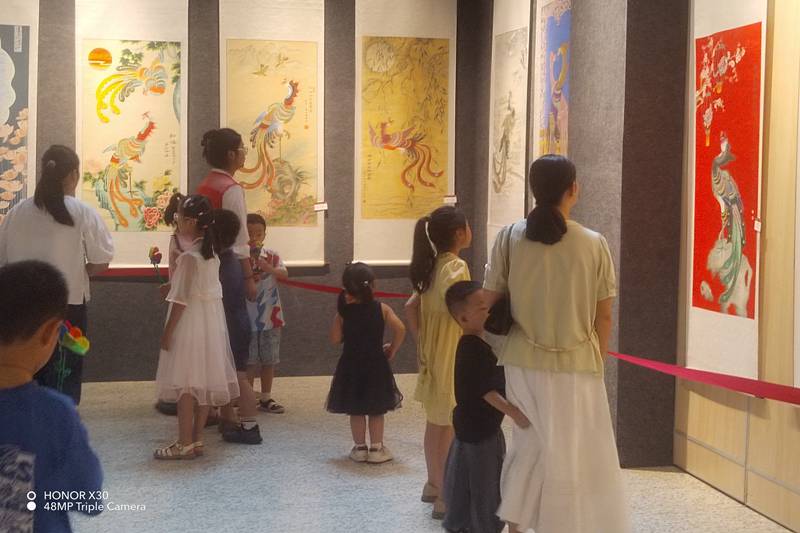 展览特设“对话”专区,将凤阳凤画与“我心目中的英雄”少儿绘画展获奖作品同场展出,让历史与英雄同屏可见。孩子们用纯真笔触表达对英雄的敬仰,凤画传承人以精湛技艺赋予传统图腾新的时代内涵,形成传统与现代、“大手”与“小手”的深度对话,让红色基因在青少年心中扎根生长,实现从“可观”到“可感”再到“可传”的升华。