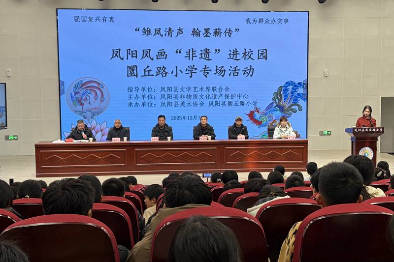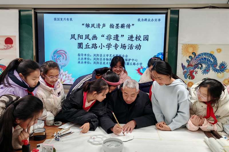 12月16日,“强国复兴有我”“雏凤清声 翰墨薪传”——安徽省非物质文化遗产凤阳凤画进校园活动在凤阳县圜丘路小学举行,县文联、县非遗中心、县美术协会、县圜丘路小学负责人及学校200多名师生参加活动。活动旨在让年轻一代亲近传统、感受经典,增强对家乡文化的认同与自信,争做优秀传统文化的传承者。