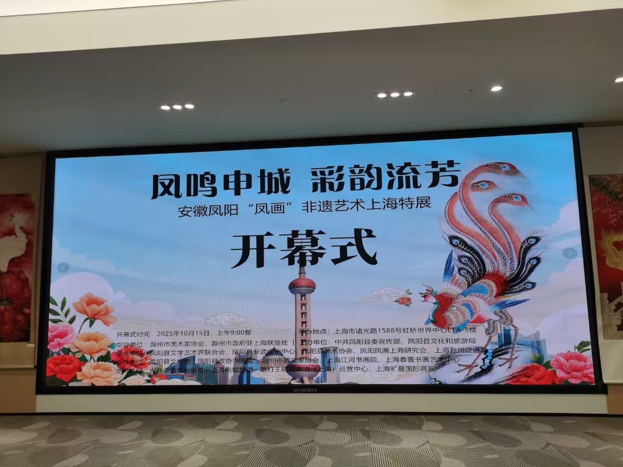 10月15日,由滁州市美术家协会、滁州市政府驻上海联络处指导;中共凤阳县委宣传部、凤阳县文旅局主办、凤阳县文联、凤阳县美协、上海滁州促进会等举办的“凤鸣申城 彩韵流芳”——安徽凤阳凤画非遗艺术特展开幕式在上海举办。此次展览共展出100余件凤画作品,凤画家们在继承传统的基础上,在形式、色彩、题材上做了些探索性的创新,亮相上海,受到申城市民的欢迎和喜爱。