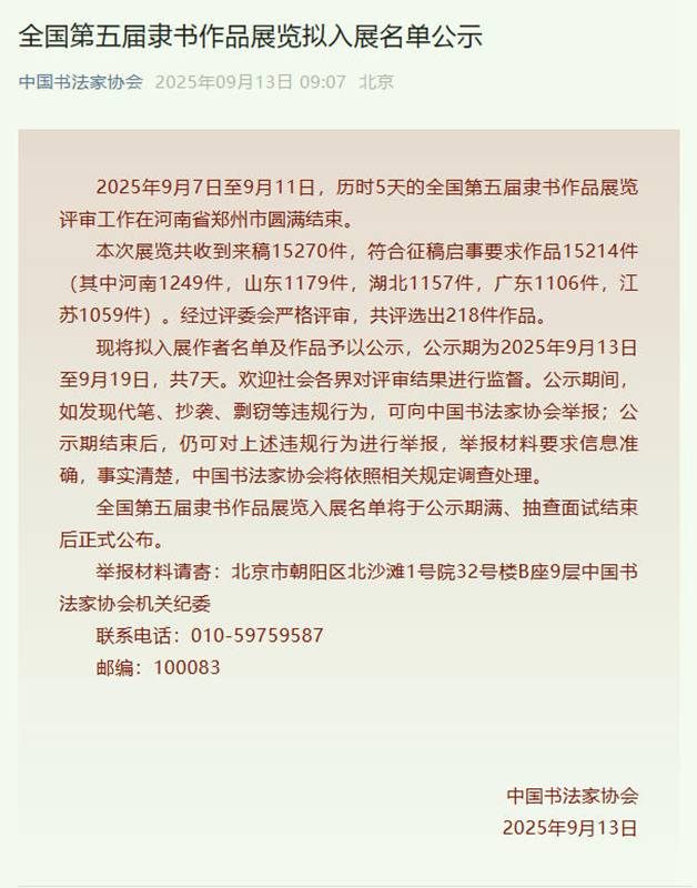 9月13日,全国第五届隶书作品展览评审结果揭晓。据悉,本次展览共收到来稿15270件,符合征稿启事要求作品15214件。经过评委会严格评审,共评选出218件作品,其中安徽省16件。我市3名作者光荣上榜,分别是:安徽省书法家协会副主席范振海、滁州市书法家协会副主席陈万祥、天长市青年书家闵泰伟老师!