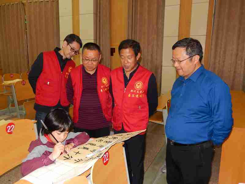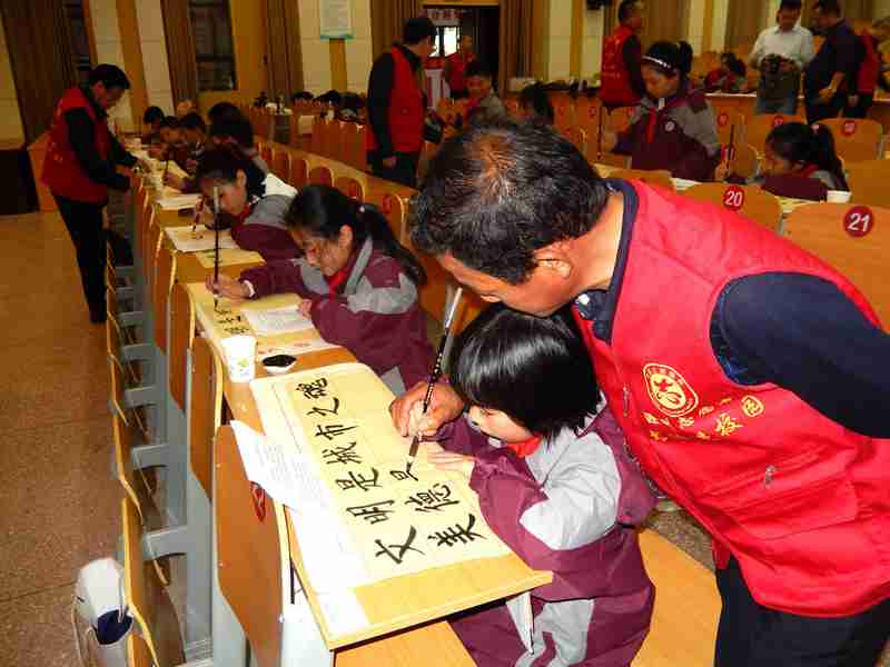 活动中,市书协范振海、许正波、周志广、董泽武、陈万祥、胡传刚、赵发龙、王元国等8位书法名家现场指导学生书写汉字,从汉字的结构、书写的技巧等方面帮助学生认识书法、纠正坐姿、握笔方法等,鼓励他们“写好中国字,做好文明中国人”。学生们专注倾听、认真书写,从颤巍巍拿起毛笔,到写下第一个完整的汉字,从羞涩、无奈,到大胆、自信,学生们充分体验了中国汉字书写的魅力。不一会儿,“文明是城市之魂”“美德是立身之本”等作品脱颖而出,受到书画名家的点赞好评。