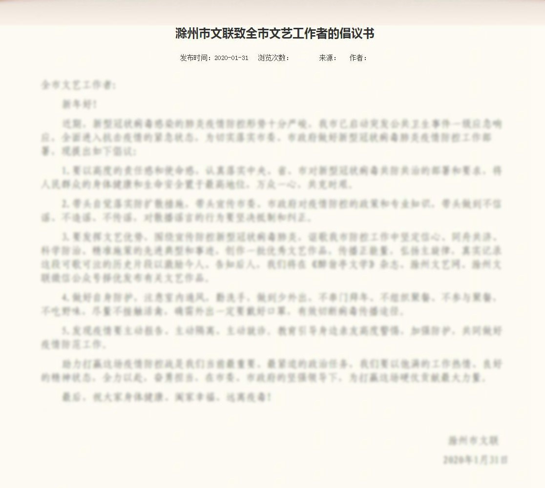 新冠肺炎疫情发生以来,滁州市文联党组认真贯彻落实习近平总书记和党中央决策部署,按照上级文联、市委市政府的倡导和安排,组织引导全市各级文联组织和广大文艺工作者迅速行动起来,在做好自身防控措施的同时,紧密结合疫情防控形势,积极发挥文艺优势,充分运用新媒体平台,组织开展了“战疫情”主题文艺创作及宣传活动,以艺术之力凝聚民众战击疫情的强大精神力量。