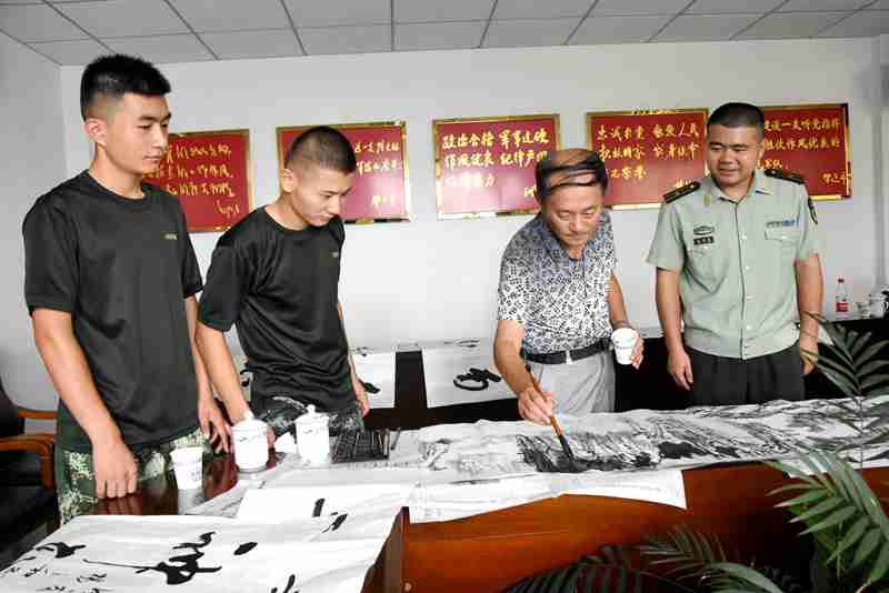 军地双方首先进行了亲切友好的座谈,各自汇报了工作开展情况。接着战士们带领文艺小分队的队员们参观了有关消防设施,进一步了解了消防安全知识。最后,十多位书画家们现场挥毫泼墨,以书画的形式向官兵送去节日的祝福,续写双拥优良传统,共绘军民鱼水情谊。