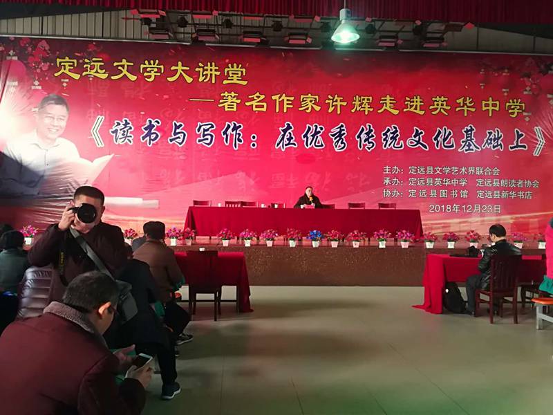 12月23日下午,安徽省文联副主席、省作家协会主席、著名作家许辉应邀做客定远文艺大讲堂开展文学讲座。活动由定远县文联主办,全县广大文学创作及爱好者和定远英华中学师生代表共1400余人一起聆听了讲座,1.1多万名观众收看了讲座现场网络直播。