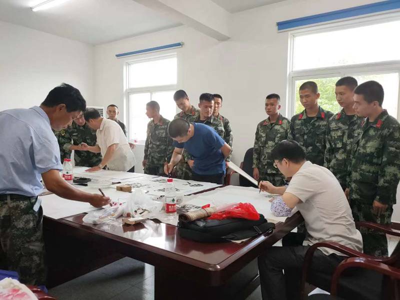 文艺演出刚一结束,几位书画家早已挥毫泼墨,手不离笔、一气呵成创作出近50幅体现新时代中国军队和战士英姿气概的书画作品全部赠送给部队,“军民鱼水情、翰墨颂双拥”的温馨场面又更进一步增进了军地情谊,营造了军爱民、民拥军、军民鱼水一家亲的浓厚氛围。