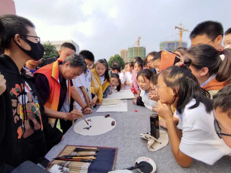 书法和美术文艺志愿服务小分队举办送书画培训进县第二初级中学会活动,组织书画家即兴泼墨,挥毫抒情,以一幅幅书画作品庆祝“双节",并现场手把手为广大学生教授中华优秀书画技艺。
