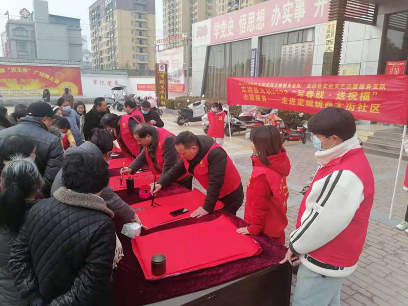 为营造欢乐、祥和、喜庆的新春佳节氛围,定远县文联于近日启动开展2022“写春联·送祝福”文艺志愿服务系列活动,先期已于1月15日、16日分别来到县城管执法局和定城镇西大街社区,为辛勤工作在一线的环卫工人、城管执法人员及社区群众们写送春联,以文艺的形式为基层百姓送上新春祝福。