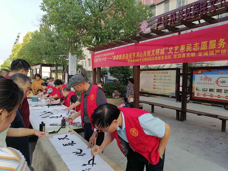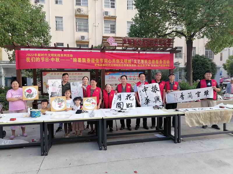 翰墨书盛景,丹青绘佳节!在2022中秋来临之际,为弘扬中华优秀传统文化,9月8日下午,定远县文联组织部分文艺志愿者在严桥路社区文化广场举办我们的节日·中秋——“翰墨飘香迎佳节·同心共创文明城”文艺惠民活动,为社区群众和奋战在文明创建一线的社区工作者们现场创作、赠送书画作品80余件,为省级文明城市创建营造浓厚的文化文艺氛围,受到社区群众交口称赞。