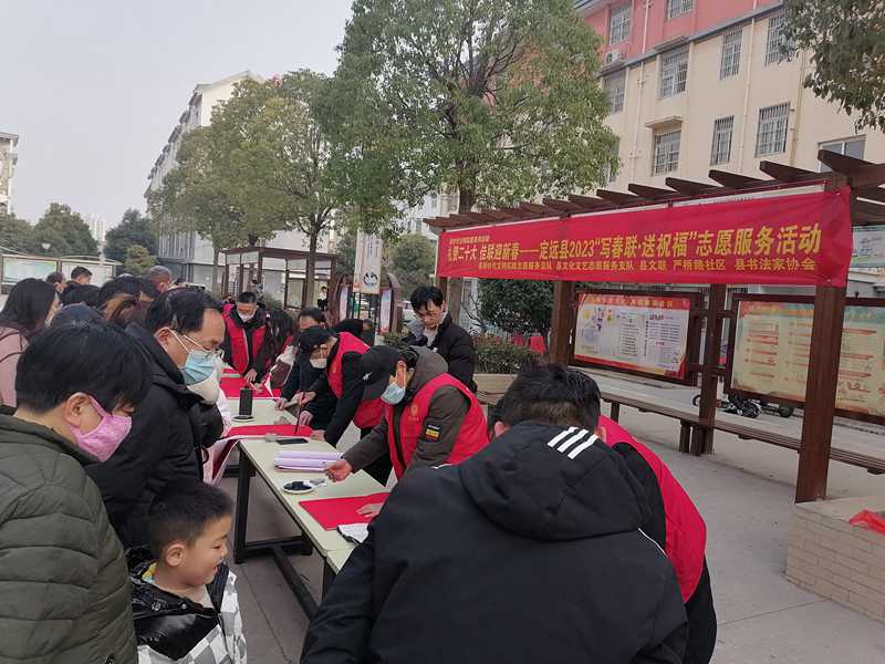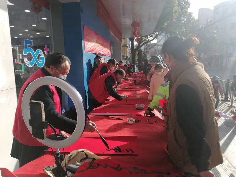 为深入学习宣传贯彻党的二十大精神,营造欢乐祥和喜庆的新春佳节氛围,1月9日下午,定远县文联、县书法家协会2023“写春联·送祝福”文艺志愿服务小分队来到定城镇严桥路社区文化广场,为社区居民送去“红红火火”的文化年货。在活动现场,书法文艺志愿者们铺纸研墨,笔酣墨饱,一副副充满喜庆、吉祥的大红春联在他们手中随笔而出。早早等候在这里的小区居民们驻足欣赏,领取一副副寄托美好心意和新春祝福的春联。