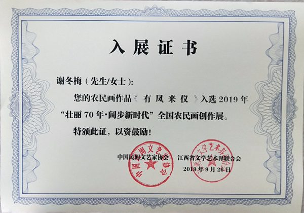 丹青歌盛世,翰墨送新风。9月26日,“壮丽70年•阔步新时代”全国农民画创作展在江西省吉安市万安田北画村拉开帷幕。凤阳凤画传承人谢冬梅创作的凤画作品《有凤来仪》入展并被收藏,这是安徽省唯一入展作品,也是凤阳凤画第三次入选全国农民画展。