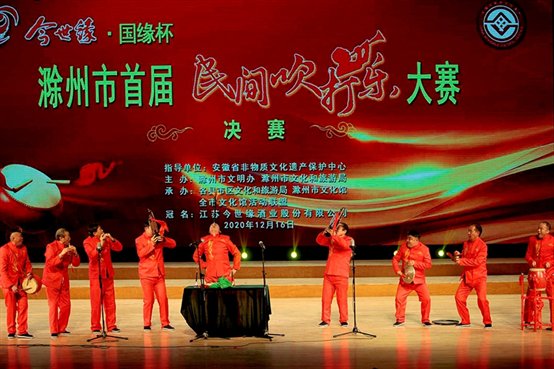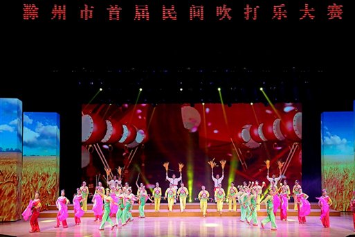 12月16日下午,滁州市首届民间吹打乐大赛决赛在滁州大剧院隆重举行。本次大赛在凤阳县花鼓艺术团、唢呐民间艺人和明光市钱杆子代表队同台表演的开场舞《在希望的田野上》拉开序幕,充分展示出了国家级非遗艺术凤阳花鼓和市级非遗艺术钱杆子独特魅力风采,引爆全场喜庆热烈的气氛。
