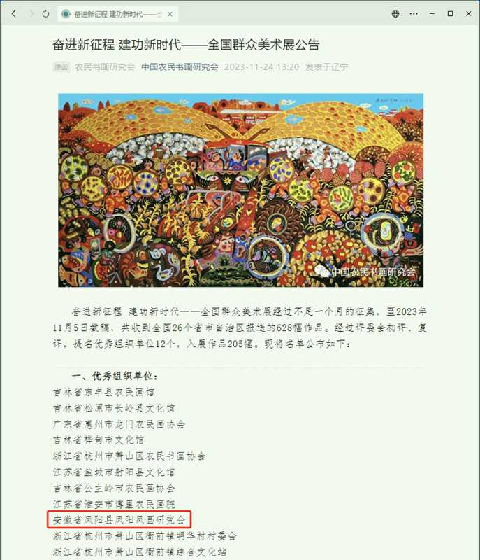 11月24日,“奋进新征程 建功新时代——全国群众美术展”评选结果出炉,凤阳县凤阳凤画研究会获优秀组织单位称号。