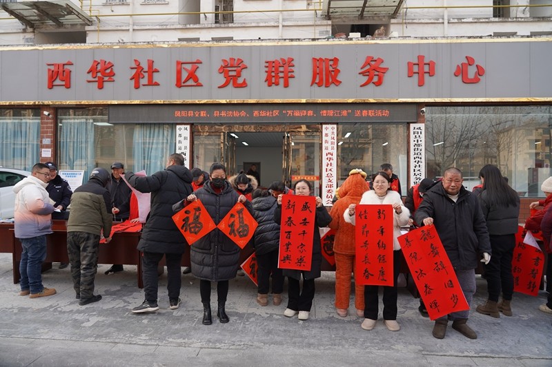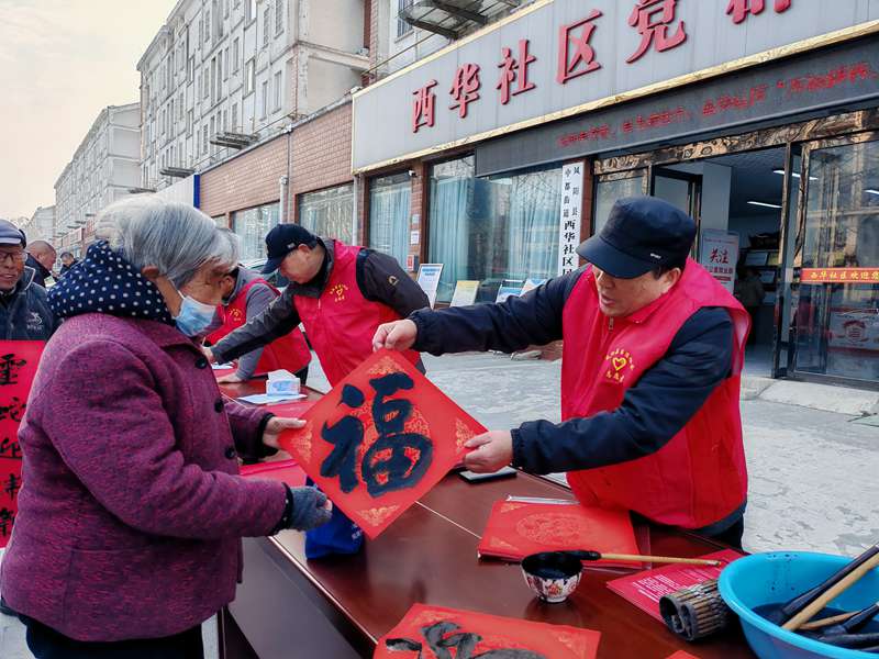 当天上午,县文联和县书协组织文艺志愿者在西华社区党群服务中心门前摆起一排长桌,铺上剪裁适当的红纸,挥毫泼墨,为广大群众送上春联、福字和新春的祝福。“盛世千家乐,新春百业兴”“龙舞辞旧岁,银蛇迎春晖”,当地居民拿到一副副满载着对生活美满、国泰民安的深情期盼的春联,高兴地连声表示感谢。经过两个多小时的紧张忙碌,志愿者共书写了500多副春联和“福”字,全部赠送给社区群众。