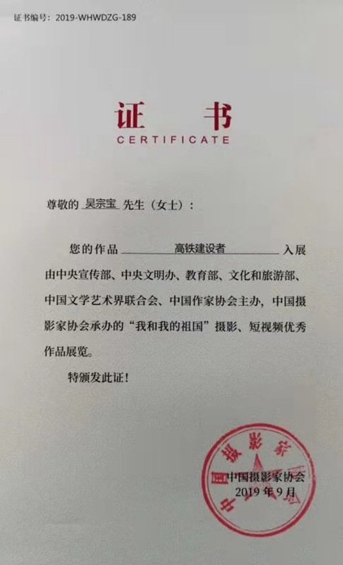 日前,中国摄影家协会会员、来安县摄影协会名誉会长吴宗宝的作品《高铁建设者》入展“我和我的祖国”摄影、短视频优秀作品展。