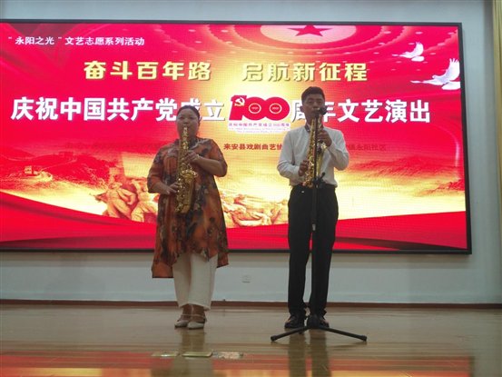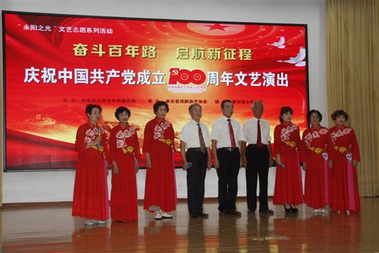 7月11日下午,由来安县文联主办,县戏剧曲艺协会承办,新安镇永阳社区协办的“永阳之光”文艺志愿系列活动,“奋斗百年路 启航新征程”——庆祝中国共产党成立100周年文艺演出在永阳社区综合活动中心顺利举行。县人大常委会原副主任厉文英、县文联主席王道琼等出席观看了演出。