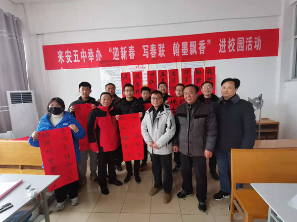 为弘扬中华传统文化,共贺新春佳节,营造温馨祥和的节日气氛,1月22日上午,受来安五中党支部邀请,来安县文联书法家协会五位书法名家和来安五中爱好书法的学子们欢聚一堂,开展“迎新春写春联,翰墨飘香进校园”活动。