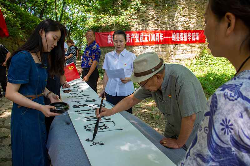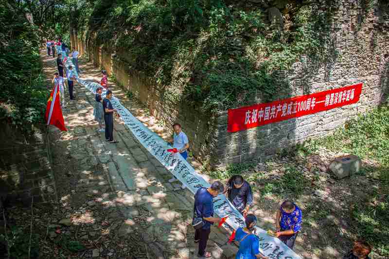 活动中,92岁高龄的老党员、滁州市著名书法家李骏在清流关千年古道关隘上挥毫泼墨,历时两个小时书写自撰歌赋《翰墨深情华诞颂》及毛泽东诗词,共576字百米书法长卷,以丹靑翰墨抒豪情,庆祝中国共产党建党百年。