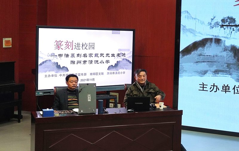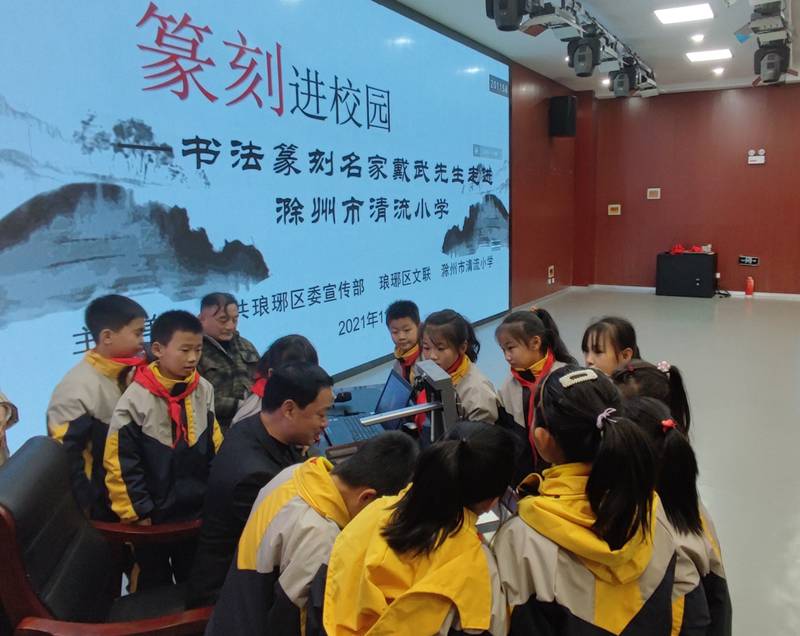 为加强未成年人中华优秀传统文化教育,让篆刻这一传统艺术在新时代校园得到传承,11月22日,由中共琅琊区委宣传部、琅琊区文联、滁州市清流小学共同主办的“篆刻进校园”活动在清流小学报告厅举行。中国书法家协会篆刻委员会委员、西泠印社社员、滁州市书法家协会名誉主席戴武先生、安徽省书协会员郑毅先生走进校园,让学生们了解并领略了传统“印文化”的艺术魅力。