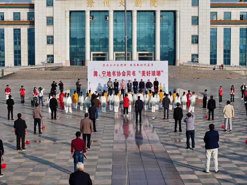 大地为纸,清水为墨。滁州市、南京市地书协会近百名地书爱好者会聚滁城人民广场挥毫泼“墨”,同时书写“美好琅琊 亭好滁州”。充分表达了滁宁两地艺术界深入学习贯彻党的二十大精神,书写新时代篇章的真挚情怀。