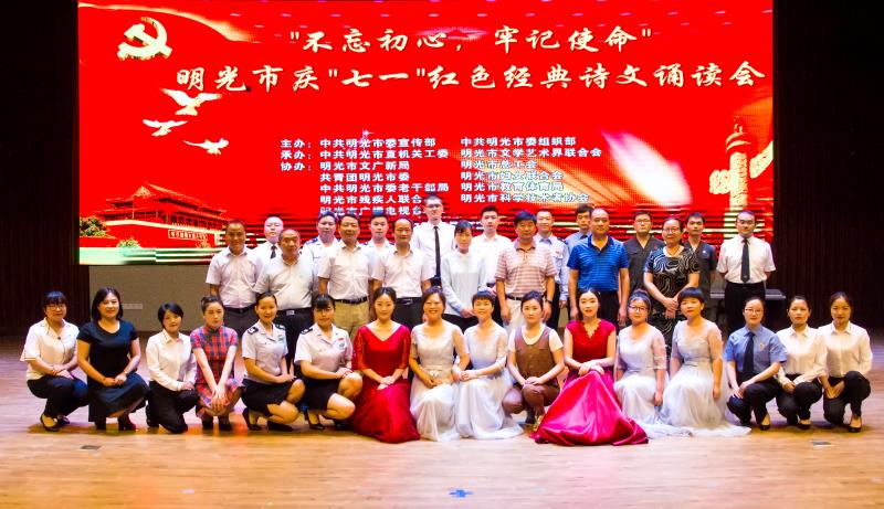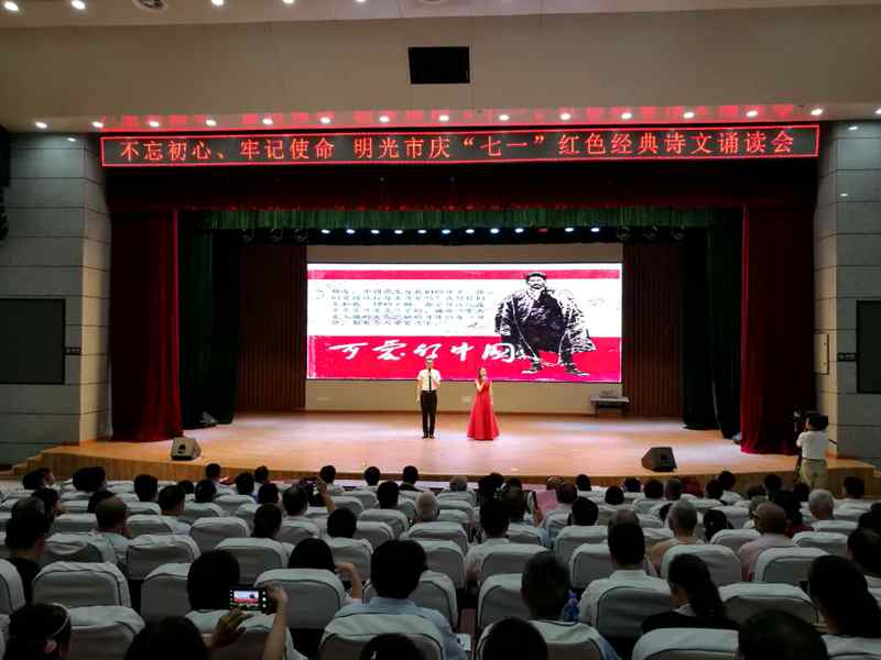 6月28日下午,由明光市委宣传部、明光市委组织部主办,明光市直机关工委、明光市文联承办以及市文广新局等协办的“不忘初心、牢记使命”明光市庆“七一”红色经典诗文诵读会,在市文化中心剧场举行。市政府副市长张艳出席诵读会,市委宣传部、市委组织部、市直机关工委、市文联等相关单位负责人及乡镇街道市直单位宣传委员、党支部书记和作家协会、诗词学会会员等共300余人参加活动。