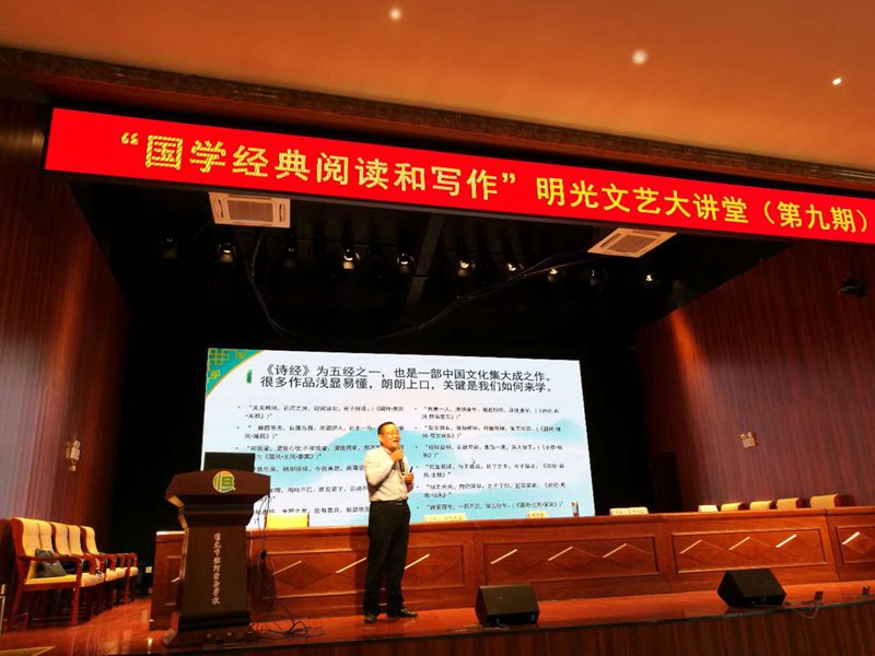 10月23日下午,“国学经典阅读和写作”明光文艺大讲堂(第九期),在滨河学校多功能报告厅开讲,市文联特邀请滁州市文联副主席、中国作家协会会员、安徽省作家协会理事贾鸿彬先生授课。明光市作家协会、市诗词学会部分会员、文学诗词爱好者、市滨河学校部分师生等600余人聆听了讲座。