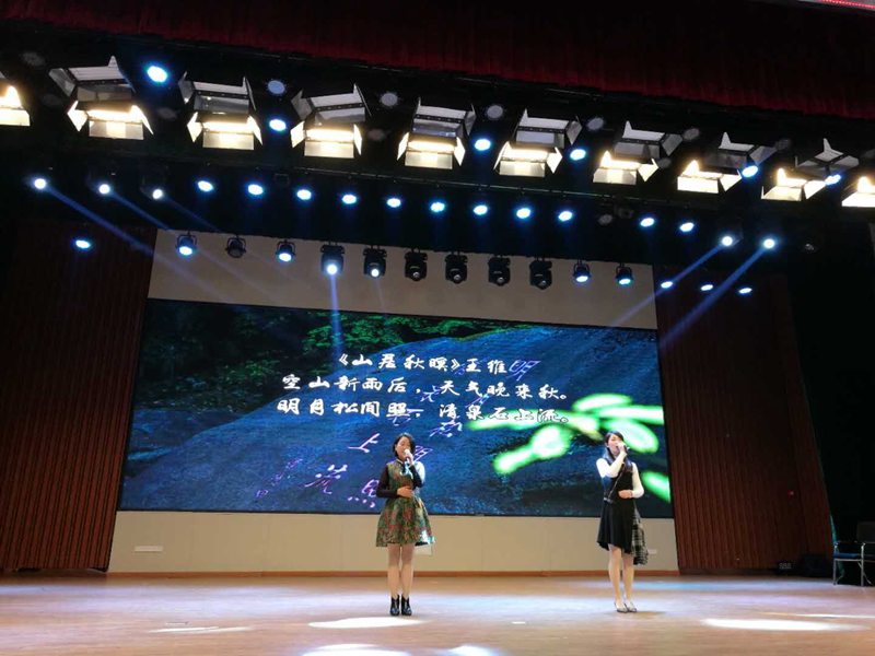 开场工小学生的古诗词诵读“礼仪之邦”尽显小小少年对传统礼仪文化的深刻理解;两位女教师的“清平调”古诗词吟唱,声情并茂;古筝独奏“渔舟唱晚”,古韵悠长;童声吟咏“悯农”、“春晓”天真可爱;自己谱曲的男声吟唱“短歌行”豪迈大气;老年大学的“阳关三叠”情真沉稳;还有笛子独奏“春江花月夜”、经典诵读秋日读诗、声声醉花阴等,最后,在女声吟唱苏轼词“水调歌头·明月几时有”中圆满结束。