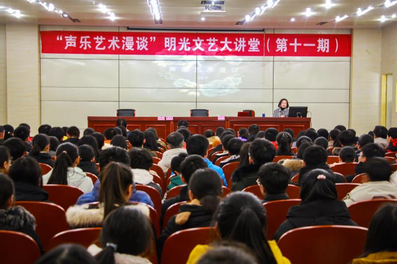 12月21日下午,由明光市文联 、明光市教体局主办的“声乐艺术漫谈”明光文艺大讲堂(第十一期),在明光市二中多功能报告厅举行,特邀请滁州学院音乐学院副教授、中国音乐家协会会员庄虹子授课。明光市委常委、宣传部长朱智青主持报告会。明光市音乐家协会会员、音乐爱好者、市二中部分师生等300余人聆听了讲座。