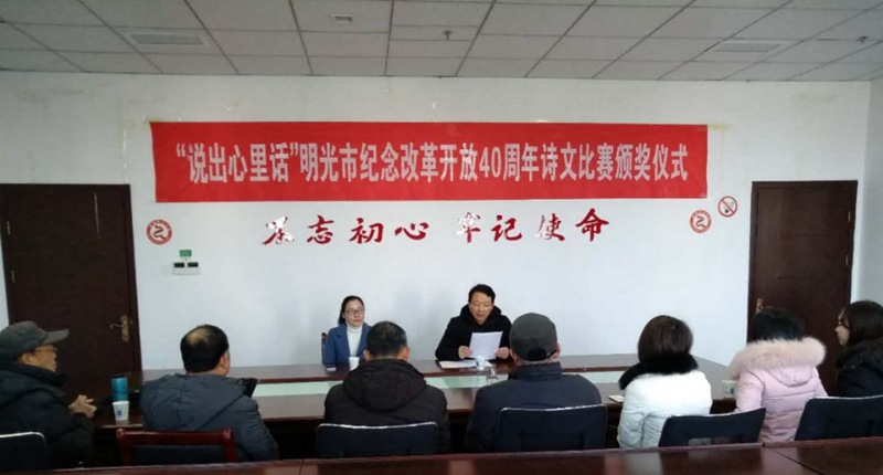 今年8月至9月,在明光市开展了“说出心里话”庆祝改革开放40周年诗文比赛征稿活动。本次征稿活动共征集100余篇(首)散文、随笔、回忆录、报告文学、现代诗歌、格律诗词等。经评审会认真评选,最终评出一等奖1名;二等奖2名;三等奖3名;优秀奖5名。
