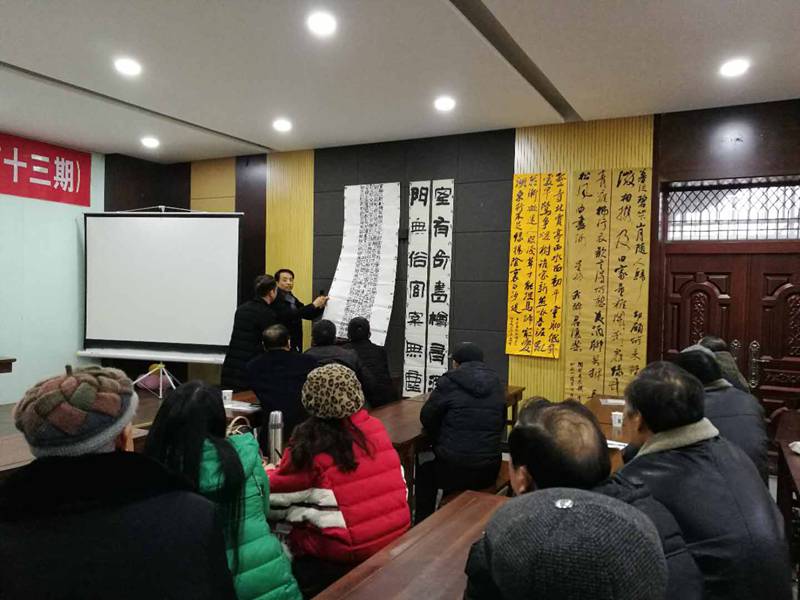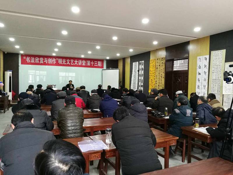 本次讲座有三个特点:第一,突出实践过程,强调“一门深入”去掉“朝三暮四”的想法,对一本“标准”好帖应当临象临透,临的形神兼备,打下创作的坚实基础;第二,以创作作品为中心,结合书法作品来解析技法以及注意事项,对比讲解、欣赏名家名作,强调凡事不会一蹴而就,学习书法要有恒心、毅力和科学方法;第三,结合自身创作实践对书法创作过程进行系统剖析,并对明光市书协会员作品进行一对一认真点评,使大家获益匪浅,对准备参加省展、国展的会员作品提出正确引导和科学方法。取得良好效果,受到明光市书协会员、美协会员和书法爱好者的一致好评。
