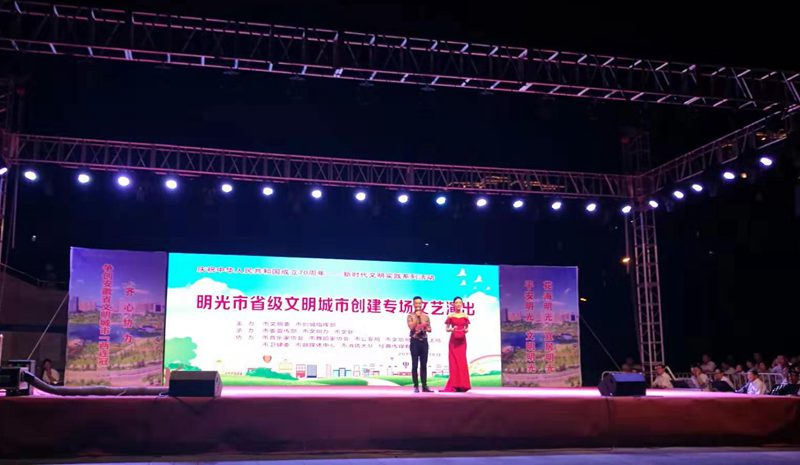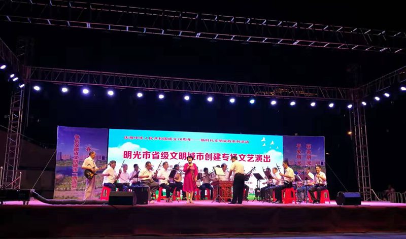 8月17日晚,明光市举办“明光之夏”纳凉晚会创建省级文明城市专场演出,明光市领导杨明乐、陶幸、刘静和近千名市民一同观看了演出。整场晚会以歌曲、演唱、舞蹈、乐器演奏等多种演出形式,呈现了一个又一个精彩节目,赢得了台下观众的阵阵掌声,获得了广大市民的一致好评。