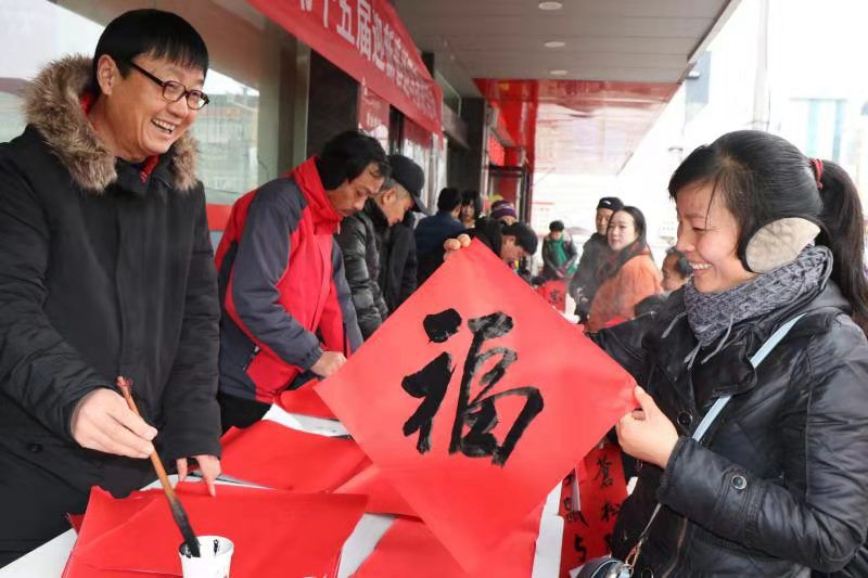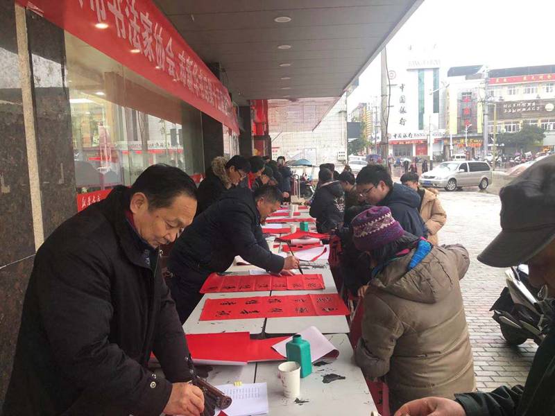虽然天气寒冷且又降小雨,20余名书协会员的书写春联的热情却不减,一上午共为市民书写新春祝福、党的政策、民生工程、扶贫攻坚、工业强市等内容的春联1000余幅。市民们手捧一幅幅称心如意对联而心花怒放,笑意写在脸上,洋溢着浓浓的年味。