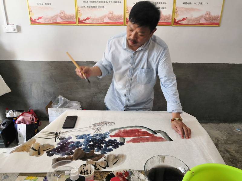 省文联文艺志愿者协会副主席兼秘书长、省书画院特聘画家、国家一级美术师谢宗君受到现场热烈气氛感染,即兴创作一幅国画《硕果》,赠送给侯胡郢新时代文明实践大院,寓意该村新时代文明实践活动硕果累累。