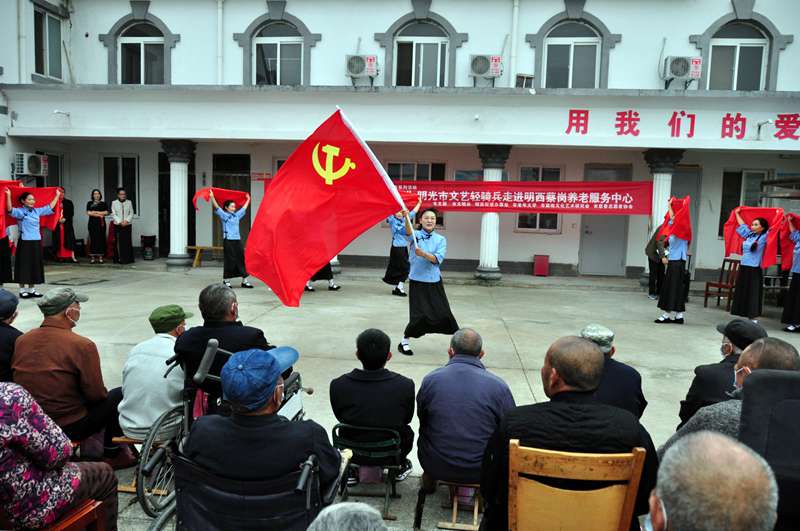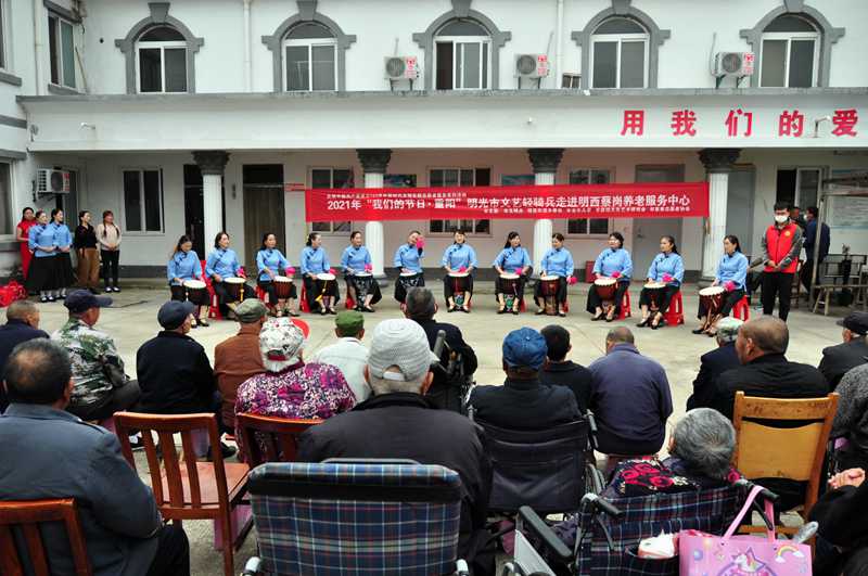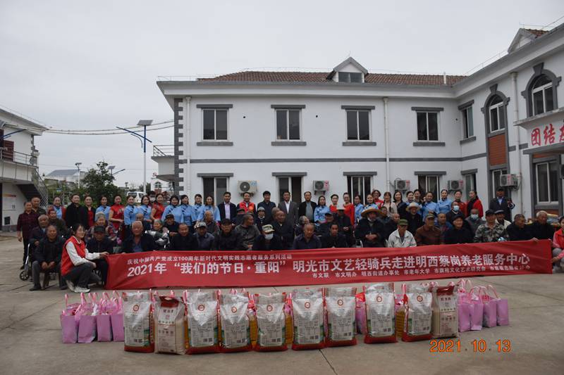 10月13日下午,明光市文联、市文明办,明西街道办事处、市老年大学、市旗袍艺术研究会、市慈善志愿者协会共同开展2021年“我们的节日·重阳”明光市文艺轻骑兵走进明西蔡岗养老中心开展慰问活动。明光市老年大学副校长傅守乾、市明西街道党工委书记于文龙、人大常委会主任姚培玉、市文联主席任亚弟、市慈善志愿者协会会长李荣、副会长卞泽西等参加了慰问演出活动。