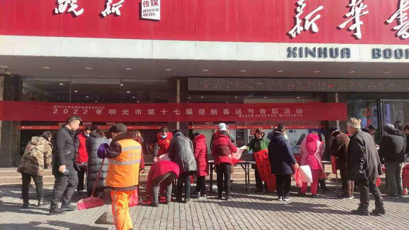 1月13日,明光市文联、新华书店、书法家协会联合举办第十七届“迎新春写春联”活动。15名书法家身着文艺轻骑兵志愿者红马甲不畏严寒挥毫泼墨,欣然为市民书写对联。现场群众既有普通职工、退休老人,也有环卫工人、快递小哥,他们围在桌前争相领取春联。