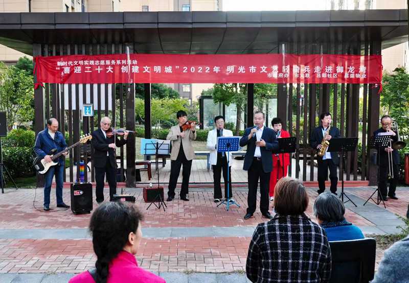 御龙湾小区包保单位明光市文联负责人,就文明创建工作进行宣讲,并宣读了明光文明16条;市音乐家协会、市舞蹈家协会、朗读者等协会文艺轻骑兵以器乐合奏、舞蹈、诗朗诵、独唱、快板书、大鼓书等形式,围绕“喜迎二十大、创建文明城”主题,让居民在家门口也能欣赏到精彩的文艺演出;同时,让小区居民感受到文明就在身边,文明城市还要靠大家的浓厚创建氛围,受到御龙湾小区居民的热烈欢迎。