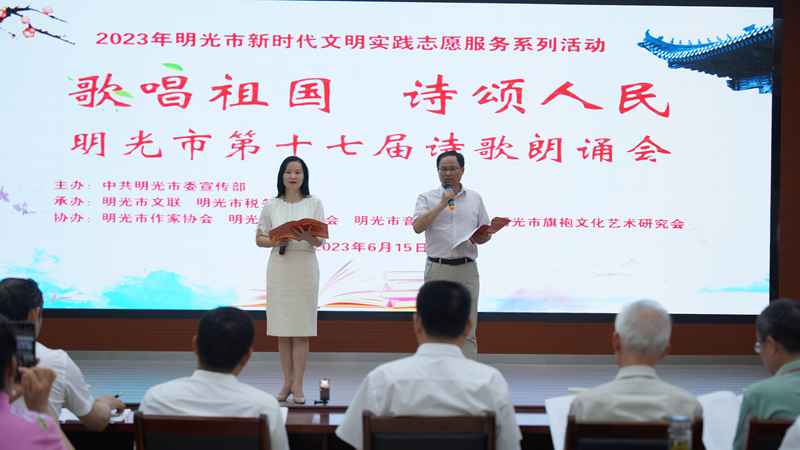6月15日,2023年明光市新时代文明实践志愿服务系列活动暨第十七届诗歌朗诵会在明光市税务局多功能厅举行,明光市人大常委会副主任高房玺、市政协副主席江家海出席,相关部门负责人及诗歌爱好者百余人参加了朗诵会。