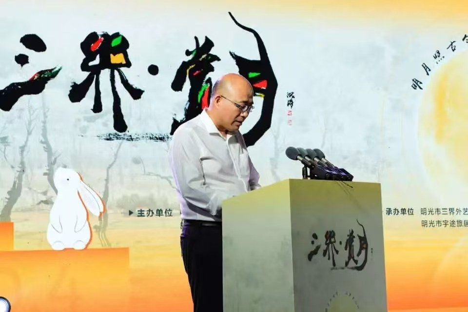 “三界外的月亮,守候千年,从未失约。三界外的梯田,借予画笔,不曾凋零。中秋之际,三界之外,江淮之畔,明光之中,我们轻抚着大别山脉的温暖,举杯邀月,与沉浮共勉:你一笔拉开了三界的蓝图,左边溪流,右边秋树,青山同醉,田园漫步。白云朵朵开,流星遮不住。蓝莓一笑,羞了翠竹,山楂一醉,迷了雨雾。小道上军歌嘹亮,山脊间红尘滚滚,天边涛走云飞,地上朝花夕度,沉浮落,画藏书,十五载春秋挥墨,笔下皖东,明光深处,是界外还是艺都?……”一首诗朗诵《三界外沉浮》把文艺演出活动推向高潮,也让观众知晓了著名艺术家沉浮先生与三界外的不解之缘。