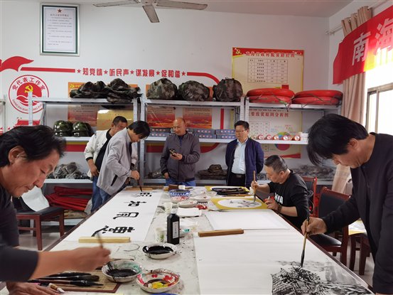 在该村村部,天长市书画家还与萧县书画家共同开展了文化惠民活动,书画家们激情洋溢,挥毫泼墨,为当地群众创作、赠送了五十多幅书画作品,受到村民热烈欢迎。天长书画家还专门为助力该村脱贫的特色菜——儿菜创作了一幅写生画,赠送给该村村委会。