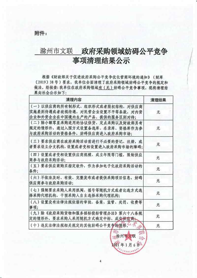 滁州市文联政府采购领域妨碍公平竞争事项清理结果公示