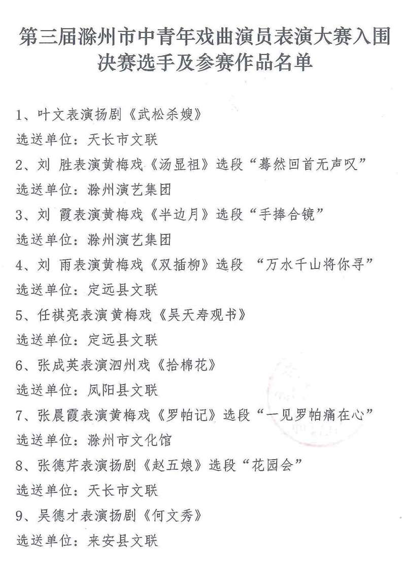 大赛自2月份发布参赛预通知后,各县(市、区)文联和市演艺集团、市文化馆紧锣密鼓开展工作,通过精心筛选、认真打磨,推选出26位选手参赛,经委托省戏剧家协会邀请专家严格复审,最后评选出14人进入大赛决赛,演出剧种涉及黄梅戏、扬剧、泗州戏、庐剧等。精彩纷呈的决赛就在本月12日下午,地点在滁州大剧院,诚邀您共享文化盛宴,共同见证折“桂”精彩时刻!