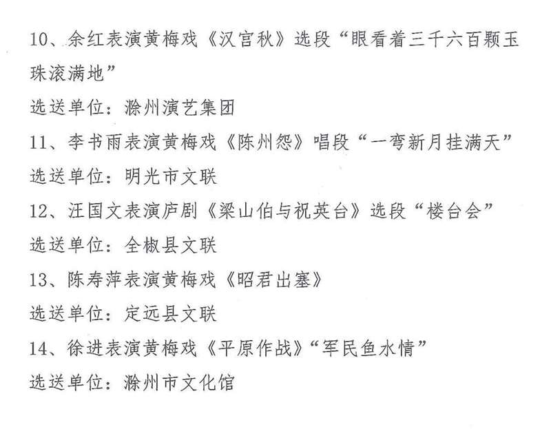 陈寿萍 2016年参加滁州市小戏调演《借丈夫》荣获第三名;2017年参加安徽省小戏调演《桂花酒》荣获优秀奖;2018年参加滁州市小戏调演《审乌盆》荣获第一名;2019年参加滁州市第一届中青年演员大赛《别洞观景》荣获三等奖;2019年参加滁州市出彩滁州人《天仙配,路遇》荣获最佳表演奖;2019年主演现代黄梅戏大戏《青山秀水》荣获滁州市优秀剧目展演;2022年参演《无字碑》荣获安徽省第九届优秀小戏线上展演;2023年参演滁州市戏曲孵化作品《新农女》。