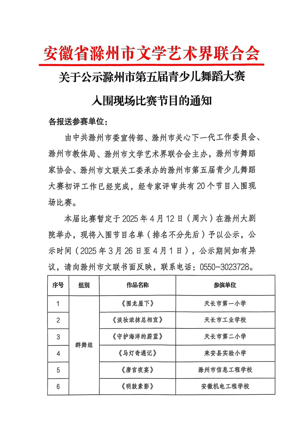 关于滁州市第五届青少儿舞蹈大赛节目入围的公示