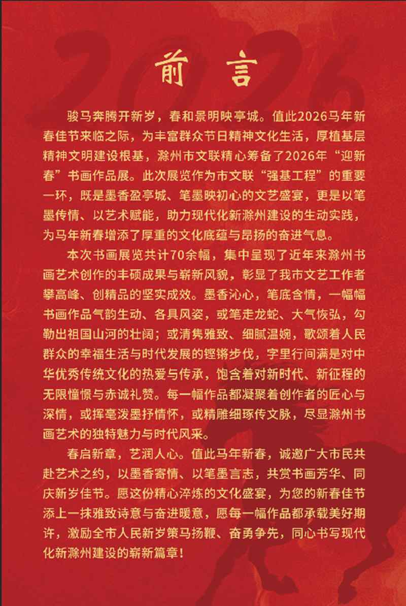 骏马贺岁,墨韵迎春。为丰富市民群众马年新春精神文化生活,传承中华优秀传统文化,彰显滁州书画艺术风采,由滁州市文联主办的2026年滁州市“迎新春”书画作品展,将于大年初一正式开展,诚邀广大市民前往观展,共赏墨香芳华,共庆新春佳节。