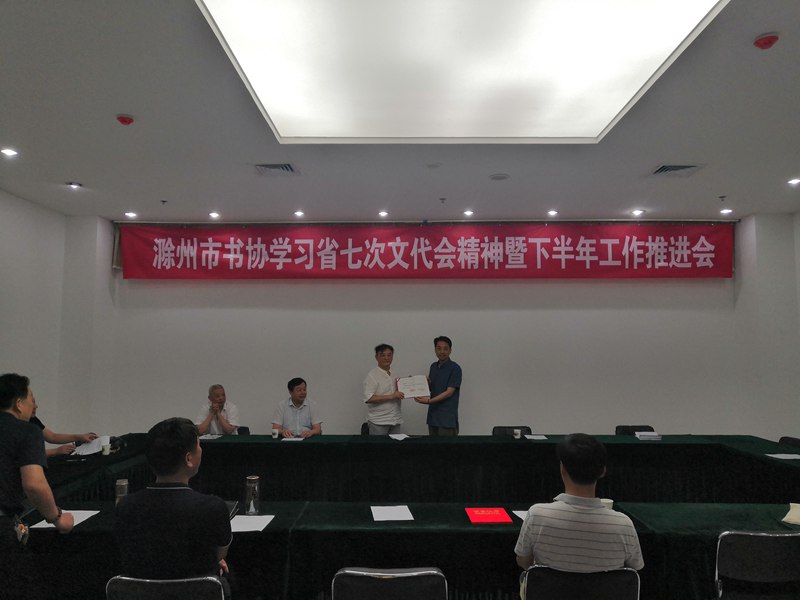 8月21日上午,滁州市书协召开学习省第七次文代会精神暨下半年工作推进会。滁州市书协主席团成员、各区县书协主席、抗疫捐赠书法作品的书家代表参加了会议。