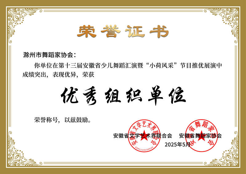 近日,滁州市舞蹈家协会喜获由安徽省文联、安徽省舞协联合颁发的第十三届安徽省少儿舞蹈汇演暨“小荷风采”节目推优展演“优秀组织单位”荣誉称号,这已是滁州市舞协连续4届获此殊荣。近年来,滁州市舞协在省舞协的关心指导和市文联党组的坚强领导下,高度重视少儿舞蹈事业的发展,将其视为推动全市舞蹈艺术进步的重要力量。为此,协会精心策划并实施了一系列富有成效的举措。