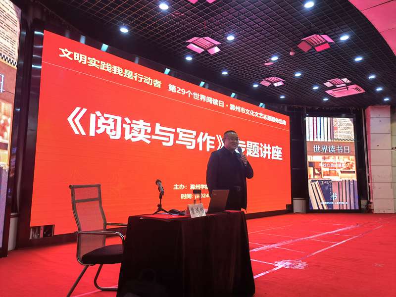 今年4月23日是第29个世界读书日,当晚,滁州市文联、滁州学院联合举办文学专题讲座暨文艺志愿服务活动,市文联原二级调研员、市作协主席贾鸿彬,滁州学院党委宣传部、图书馆、团委、文学与传媒学院有关负责同志出席活动。滁州学院部分师生及我市作家、文艺志愿者共200余人参加活动。活动由文学与传媒学院党委书记王诗根主持。
