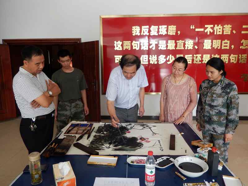 活动中,王伯阳、朱多全、董泽武、夏继德、徐坤、易楠远、王元国、杨德泉、倪晓云、周仁山等10名书画家现场挥毫泼墨,创作军旅题材书画作品,为军营送来丰富的精神食粮。书画家们一边笔走龙蛇、浓墨重彩,一边与官兵交流书画创作欣赏体会,细心为官兵讲解书画知识,传授书画技巧,创作现场氛围活跃。