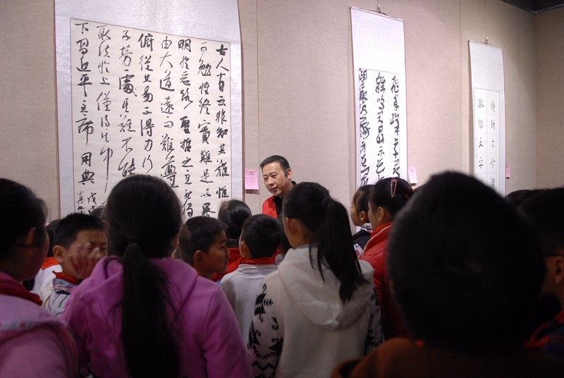 同学们在老师的带领下,整齐有序地步入展厅,市文联文艺志愿者、中国书法家协会会员、滁州市书法家协会理事许正波先生在现场,为同学们介绍中国书法文化的深刻内涵和参展的书法作品。他从书体、风格、内容到字法、笔法、章法等方面对作品进行详细讲解,或是介绍某个字的结构韵味,或是介绍某种字体的用法内涵……同学们听得津津有味、看得认真仔细,并不时提出问题,在问与答之间,现场气氛愈加浓烈。