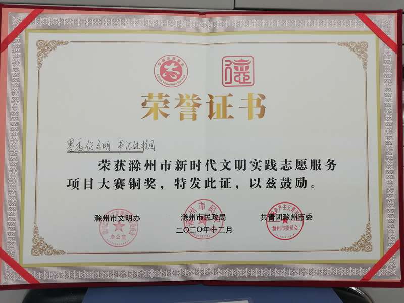本次大赛由市文明办、市民政局、共青团滁州市委联合主办,主题为“志愿建功新时代,文明实践我先行”。大赛从11月开始初赛,共有62个志愿服务项目参赛,经过激烈角逐,“墨香促文明 书法进校园”项目进入决赛,最终获得铜奖。