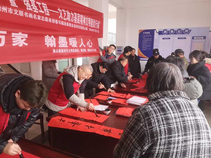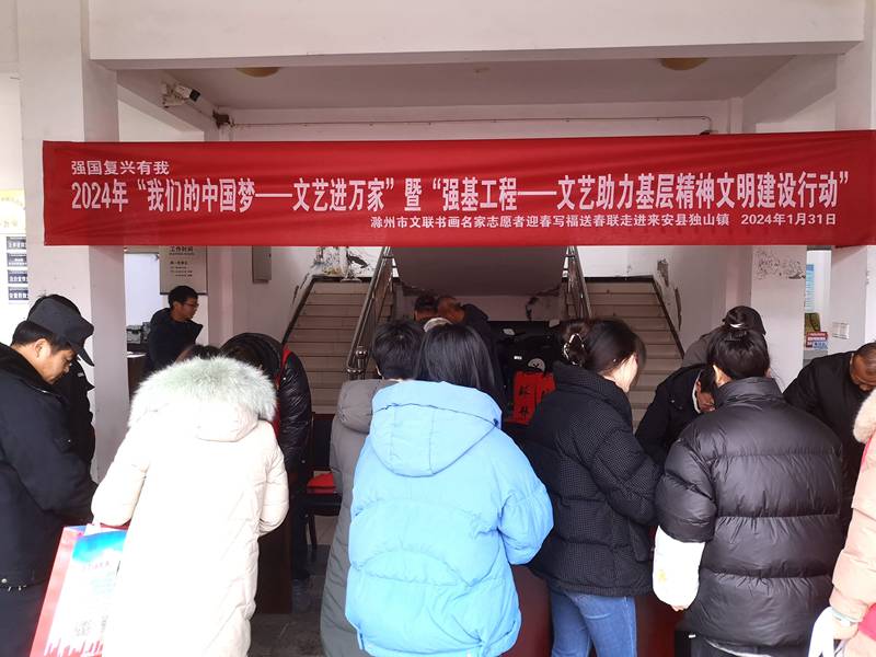 1月31日上午,市文联组织书画文艺志愿者赴来安县独山镇,开展“我们的中国梦——文化进万家”暨“强基工程—文艺助力基层精神文明建设行动”迎春写福送春联第四场活动,来安县文联文艺志愿者共同参与活动。